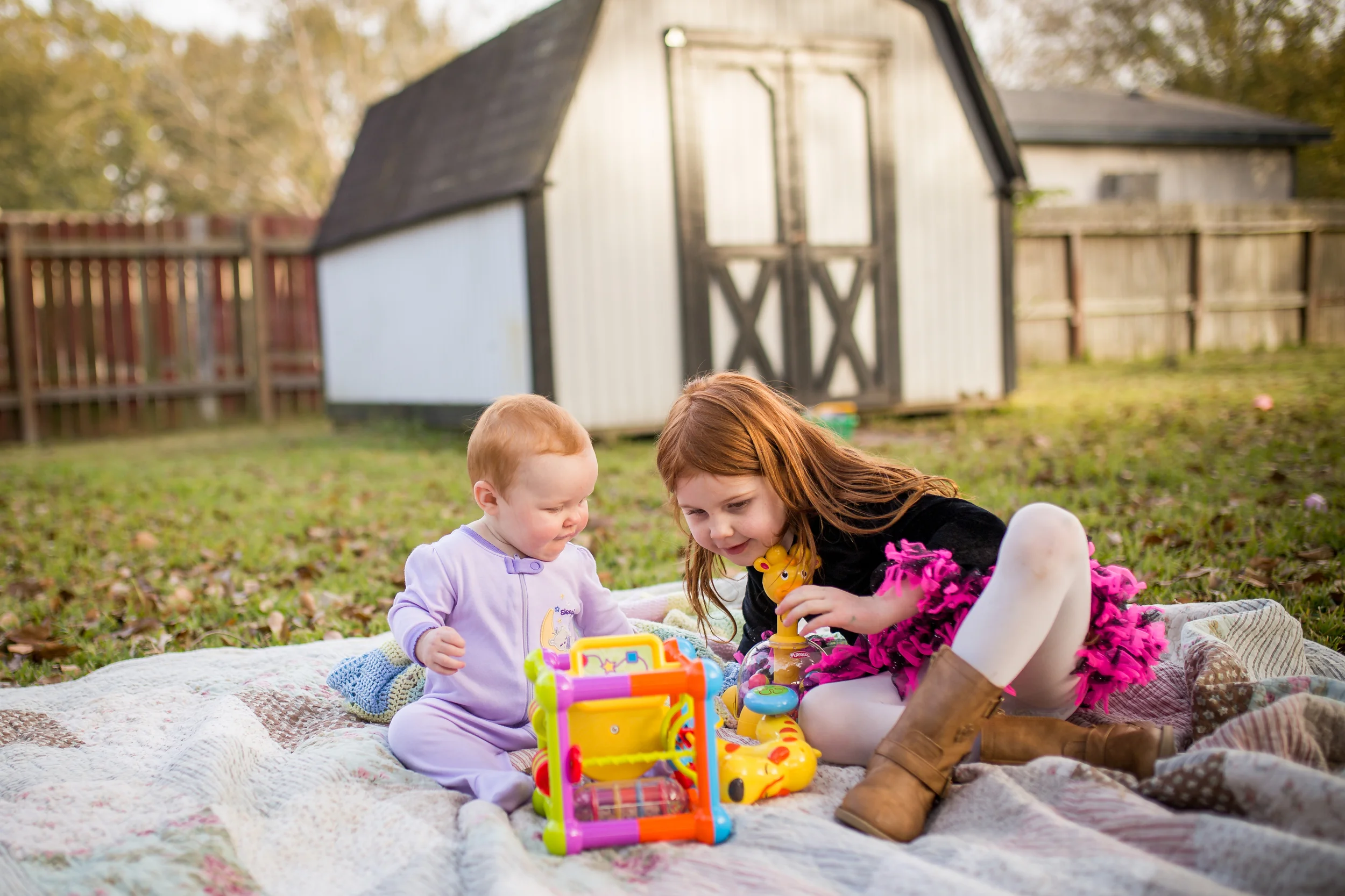 This week's theme is sibling and play. I love these images because it's about letting them be who they are. The weather was especially nice earlier on. That's a perk of living in Cypress, TX: year around play in the backyard! Ha! ;) For this set up, Emma wanted to have a picnic, so I simply laid a quilt out, placed some toys on the ground, and let them play.