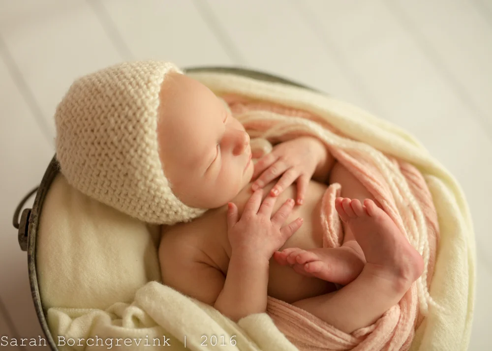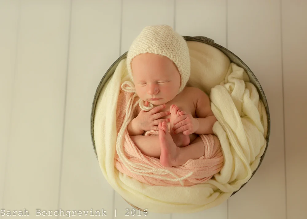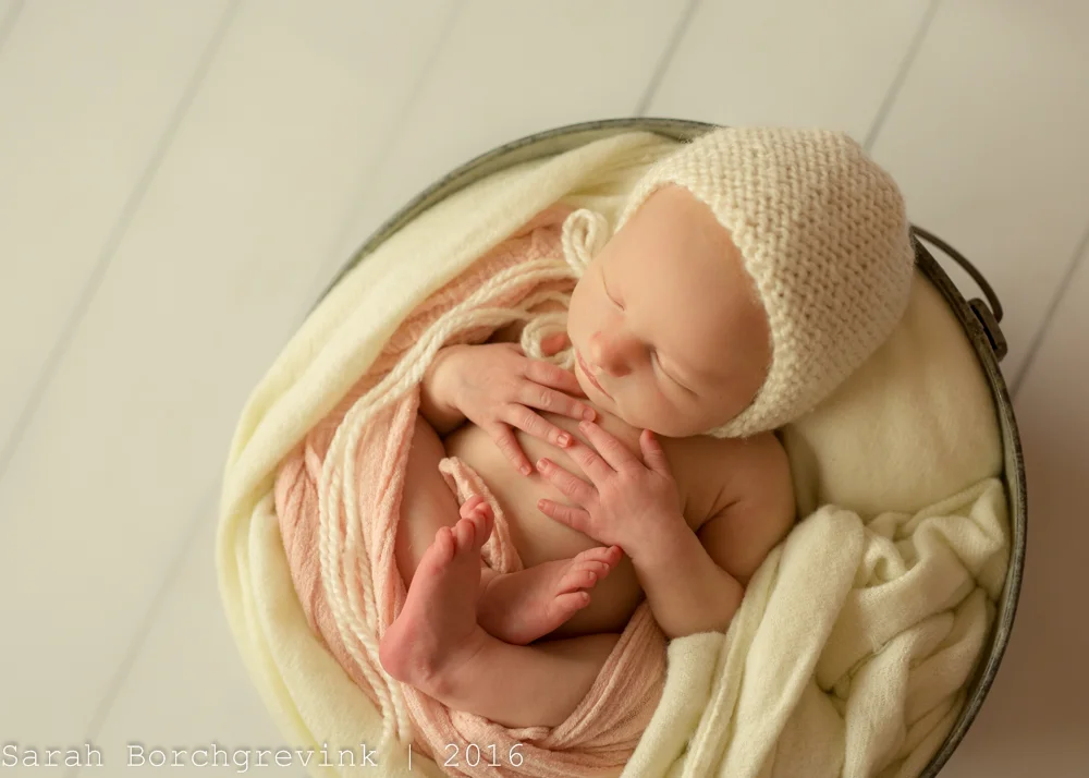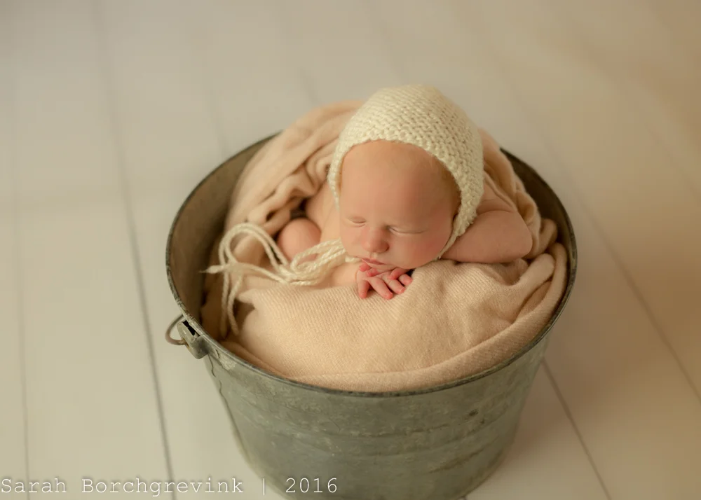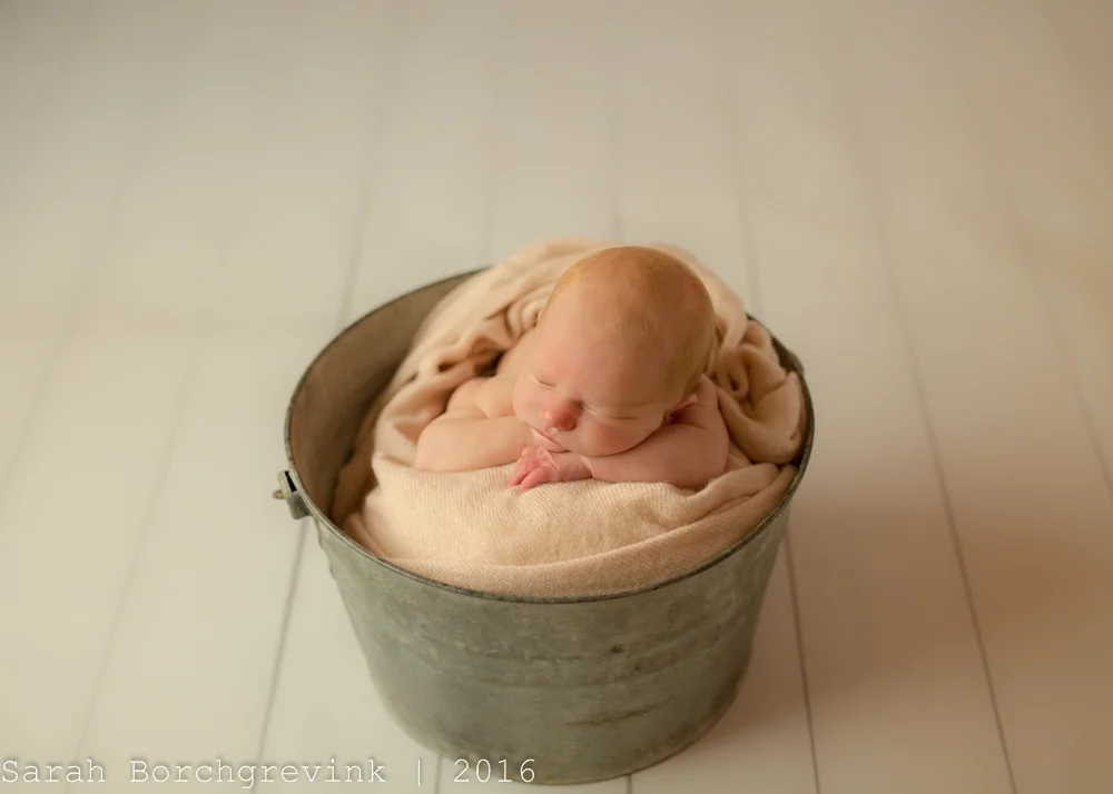 All of your newborn sessions come with 2 floor props. We used an antique, grey bucket as well. I brought along the white floors because they add an organic, stunning tone to the image. They reflect the pureness and soft stillness of a new baby girl.