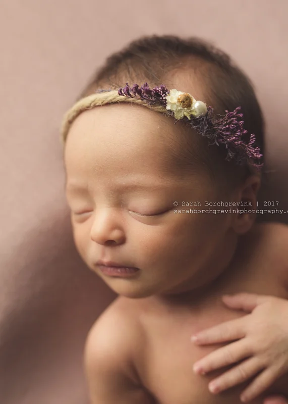 For sweet baby's session, our color focus was mauve, cream and grey with rustic floor props that lend a vintage vibe. My newborn photography is both fresh and timeless. 20 years from now, you'll hold the photos and simply be in awe of all her little features, curly nature, and the way the light fills her perfect face.