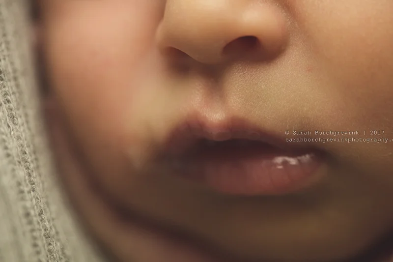 Moreover, for each newborn session, lifestyle or posed, I always include macro images. Macro portraits are the up close details of baby from their lips, eyelashes, tufts of hair, and of course button noses. These are the details you've spent hours memorizing; you rock your baby in her nursery and stare lovingly into her face. Little ones change and grow quickly; it's not until you have a baby do you realize how fleeting time truly is.