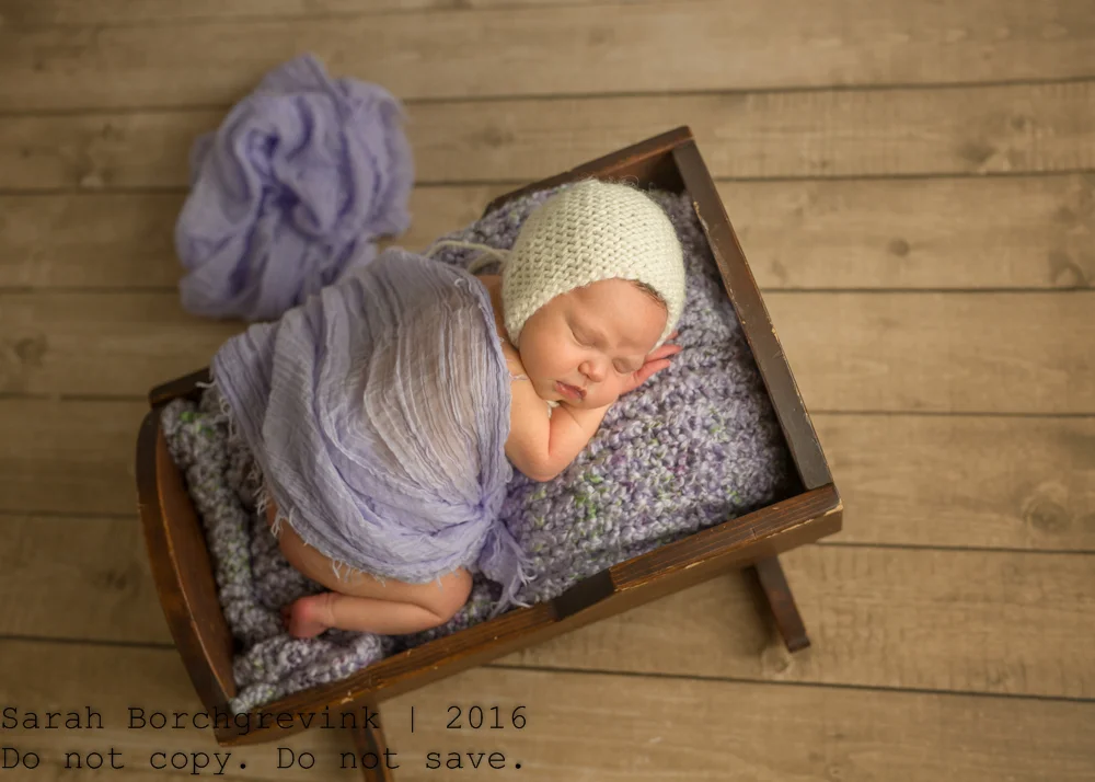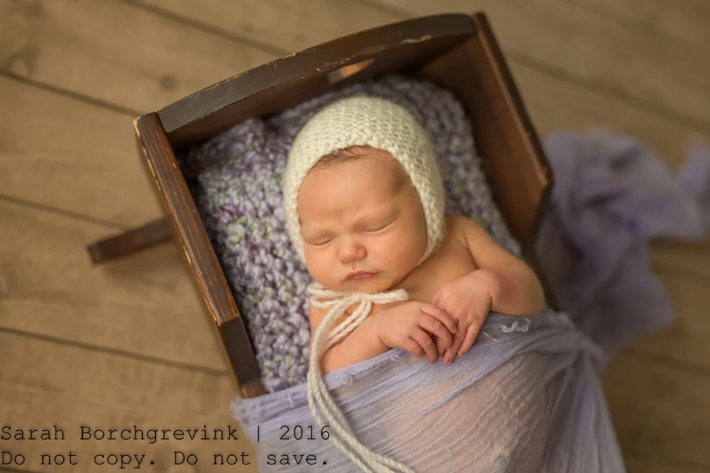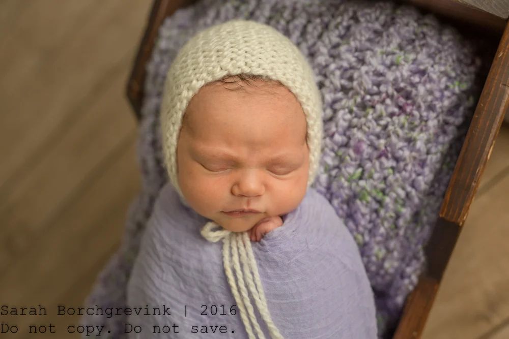 When designing your session, your color and prop preferences are always considered, of course! For this adorable little one named Natalie, her Mama expressed loving the color purple. So, like a good photographer, I made it happen, ha! Lovely different purple hues were used to highlight mom's preferences and ensure she loves the styling. We also utilized a soft heather grey and cream accents to ensure the purple is not too overpowering for the delicate nature of a brand new fresh little baby!