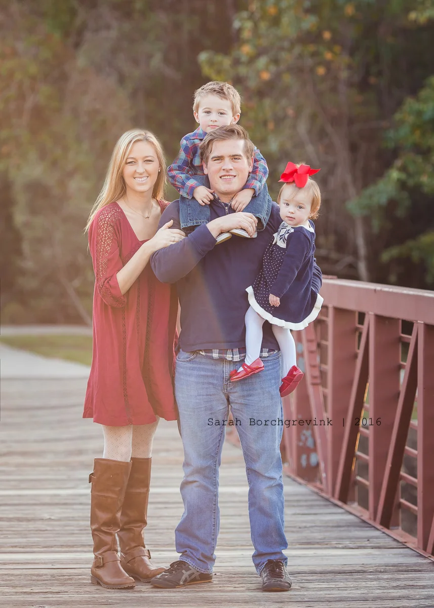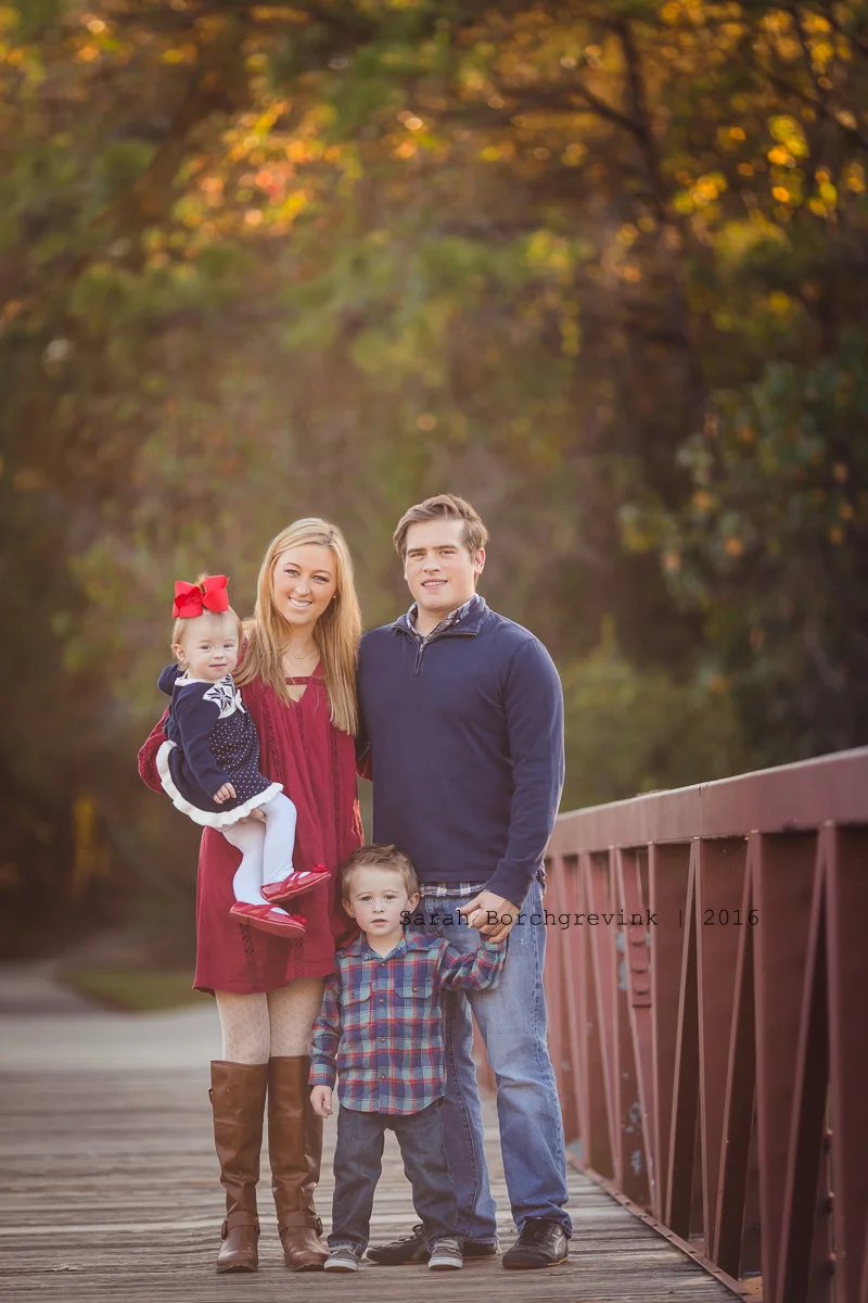 To begin, here is the A family. Not only have I photographed several sessions from them, I know them from high school. 10 years later they're married with two incredibly adorable little ones. For their winter family photos, we met in The Woodlands TX at a little park boasting a rustic bridge and fall foliage. These elements lend a timeless feel to your portraits.