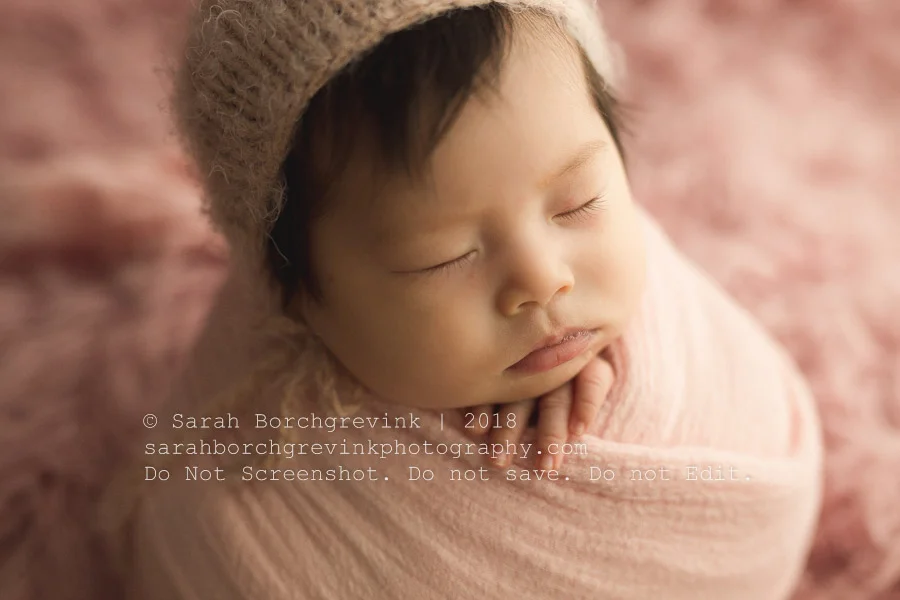 Miso is a beautiful baby girl girl who weighed 6 pounds at birth. She was born on her due date in March 2018, specifically on the 3rd. When she visited my studio, she weighed a little over 9 pounds and had the creamiest, fair skin - so pretty! Mom requested all things girly for her session such as a muted pink to showcase the feminine aspects of a brand new girl. She was very alert for part of her session, giving me incredible eye contract! Her almond shaped eyes are full of wonder and truly soulful.