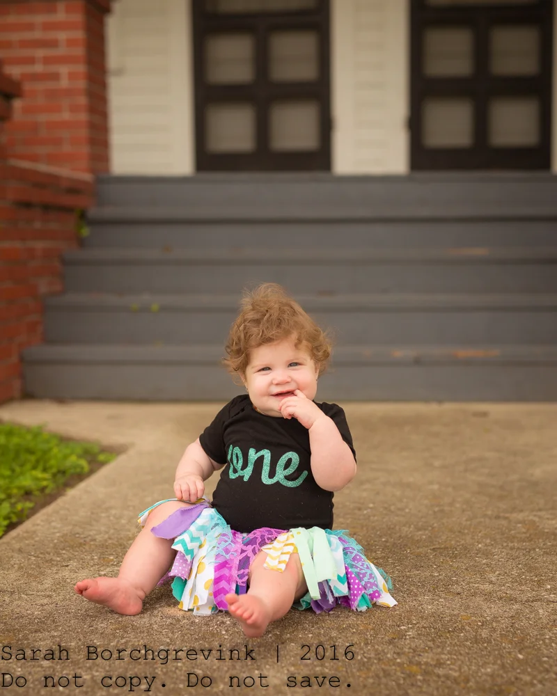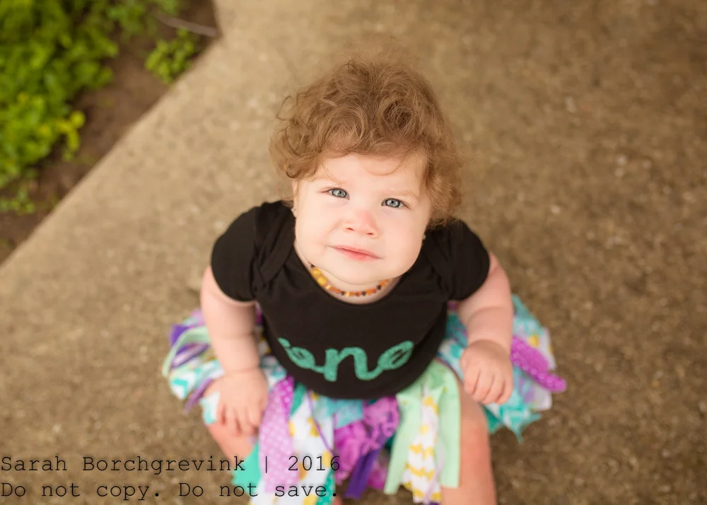 After the cake smash portion, we cleaned Ellie up and let her play in her diaper. This is a wonderful way to end the session - to create an organic atmosphere in which the baby simply enjoys being outside and we can show all the cuteness of a newly turned one year old such as their little chunky arms, locks of hair, or chubby feet.