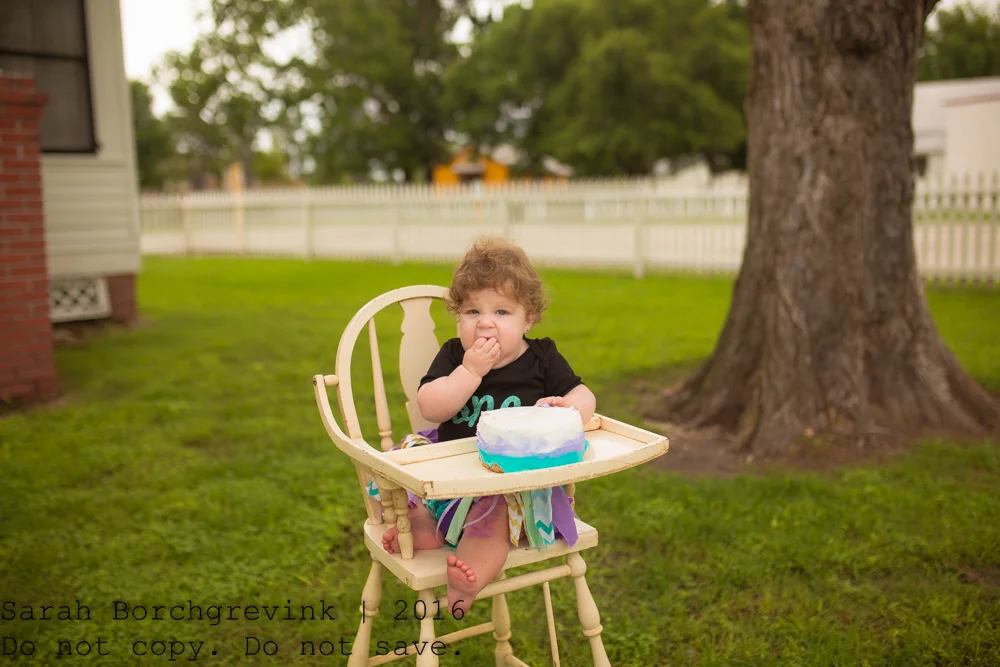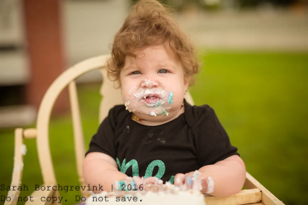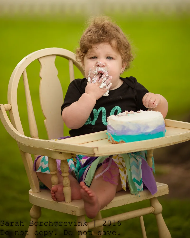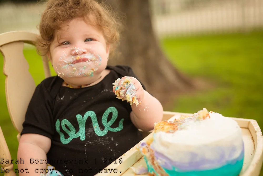 Once I introduced the actual cake to Ellie, she dug right in! During this portion of the one year old photos I take photos of everything from the child in the high chair (which I provide), from her reaching for the cake, her hands in the cake, etc. All of those tiny details really make the gallery shine and provide you with a classic collection of images you'll treasure forever.